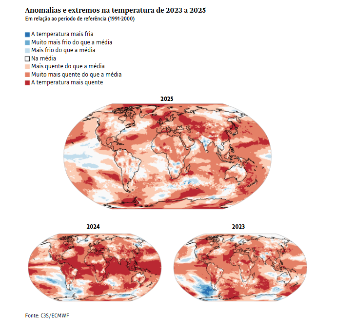 - A temperatura média global em 2025 foi de 14,97 °C, valor 0,59 °C acima da média de referência (1991-2020) e 0,13 °C abaixo da marca de 2024, o ano mais quente já registrado;