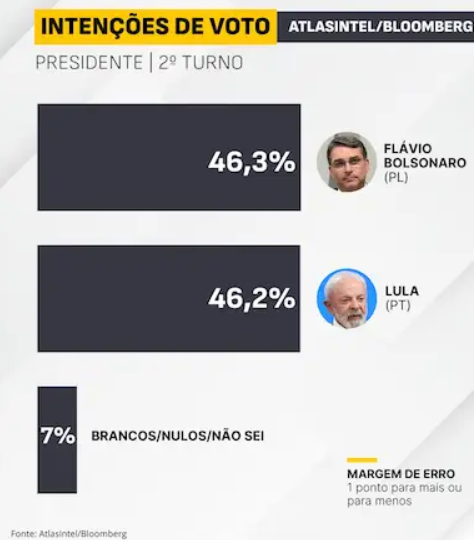 A variação indica crescimento de 1,4 ponto percentual de Flávio no segundo turno e queda de 3 pontos de Lula entre as duas medições. No acumulado, a diferença de 4,3 pontos pró-Lula registrada no início do ano é revertida para um cenário de equilíbrio.